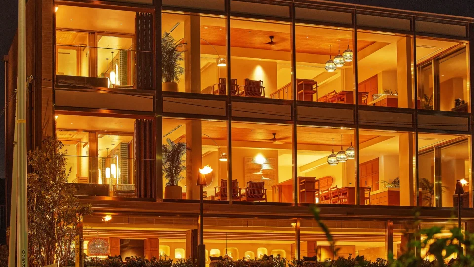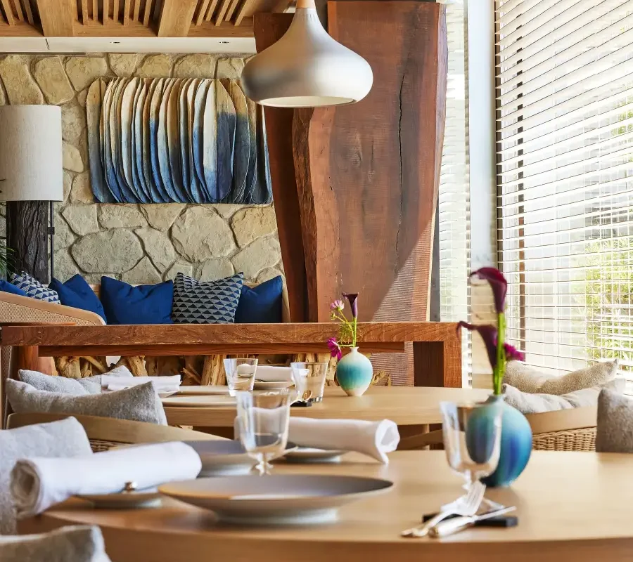 夕暮れが夜へと変わりゆく時間には、サンセットとキャンドルの光が静かに交じり合い、レストラン全体がやわらかい輝きに包まれます。